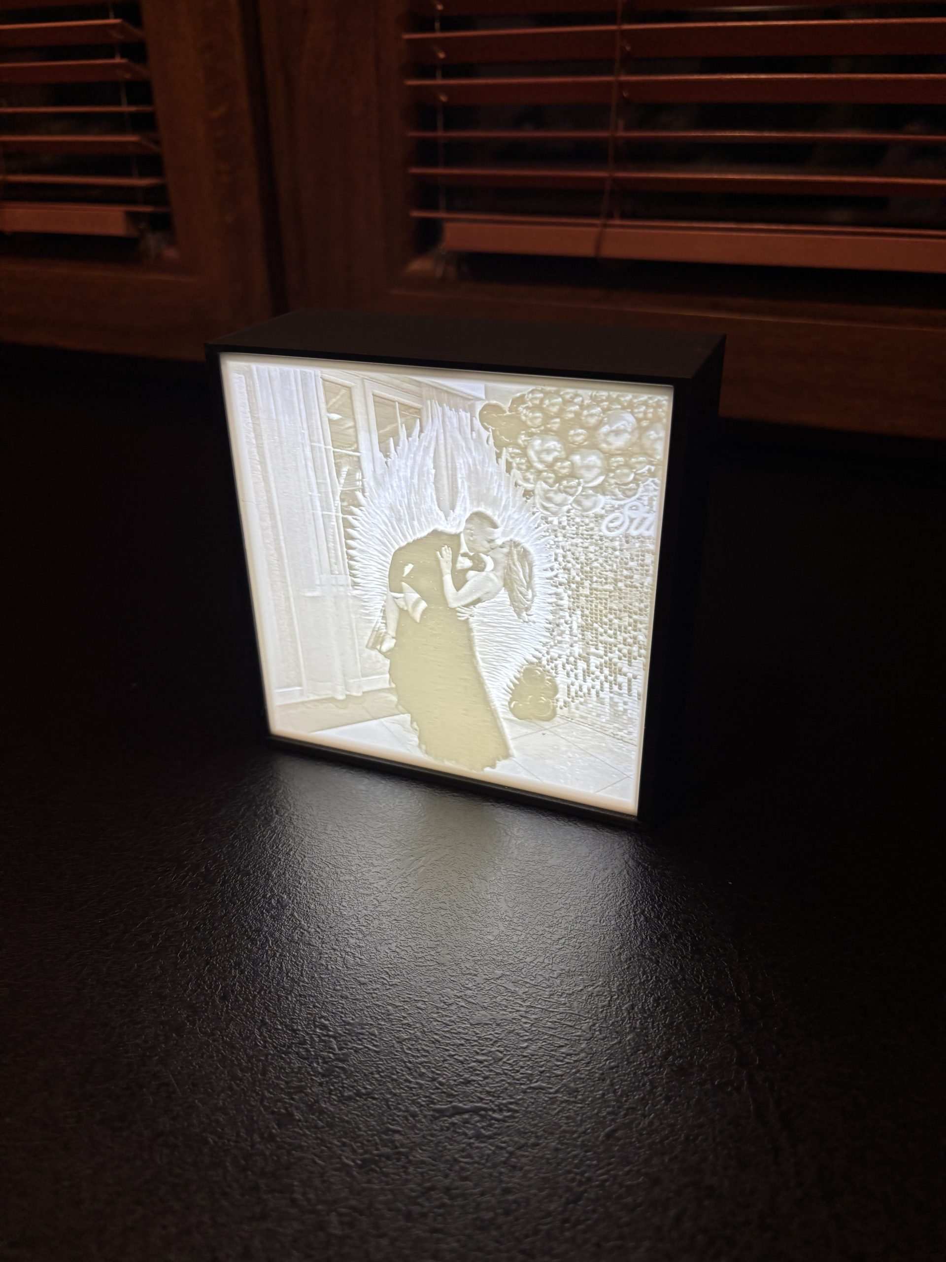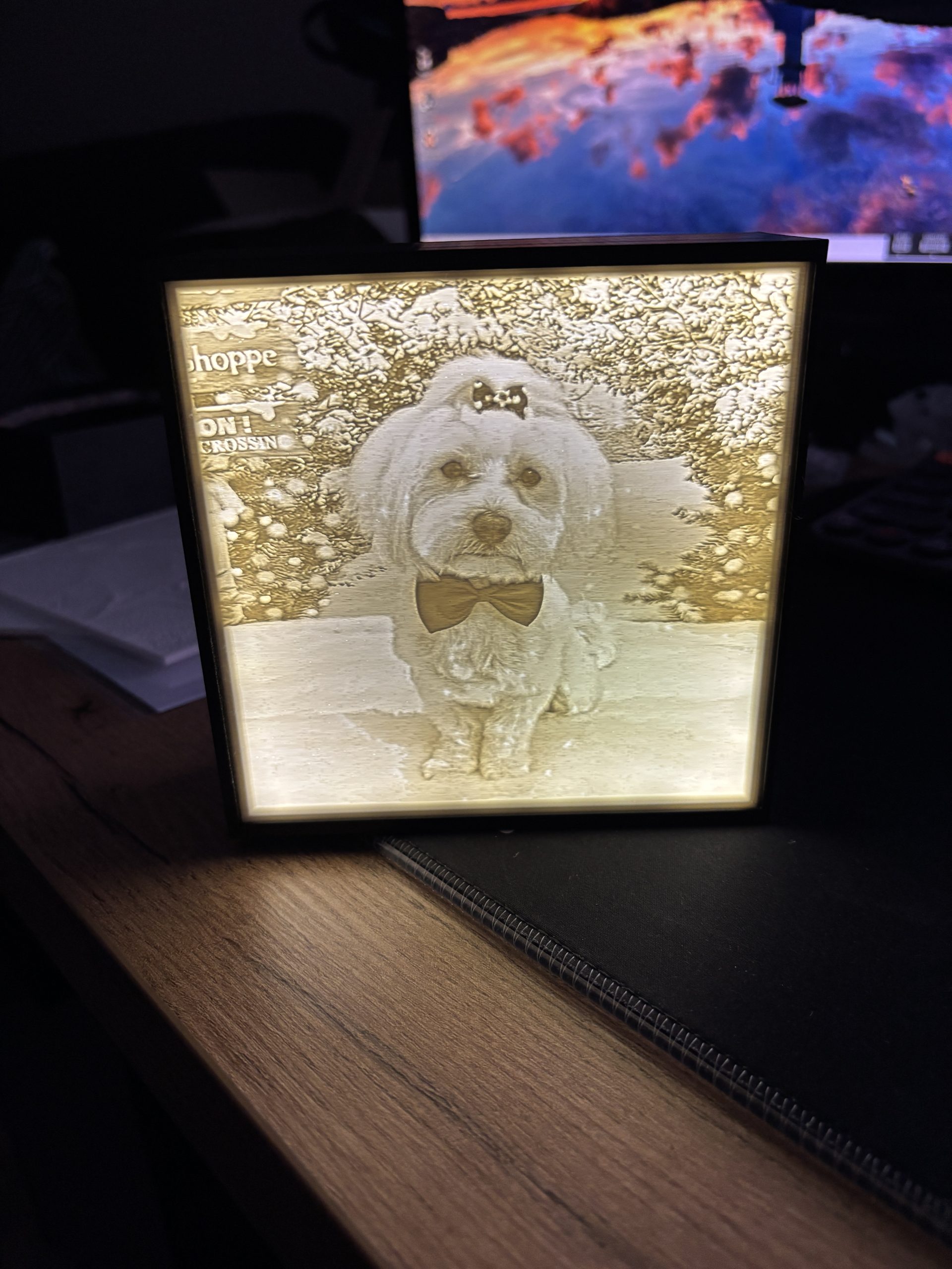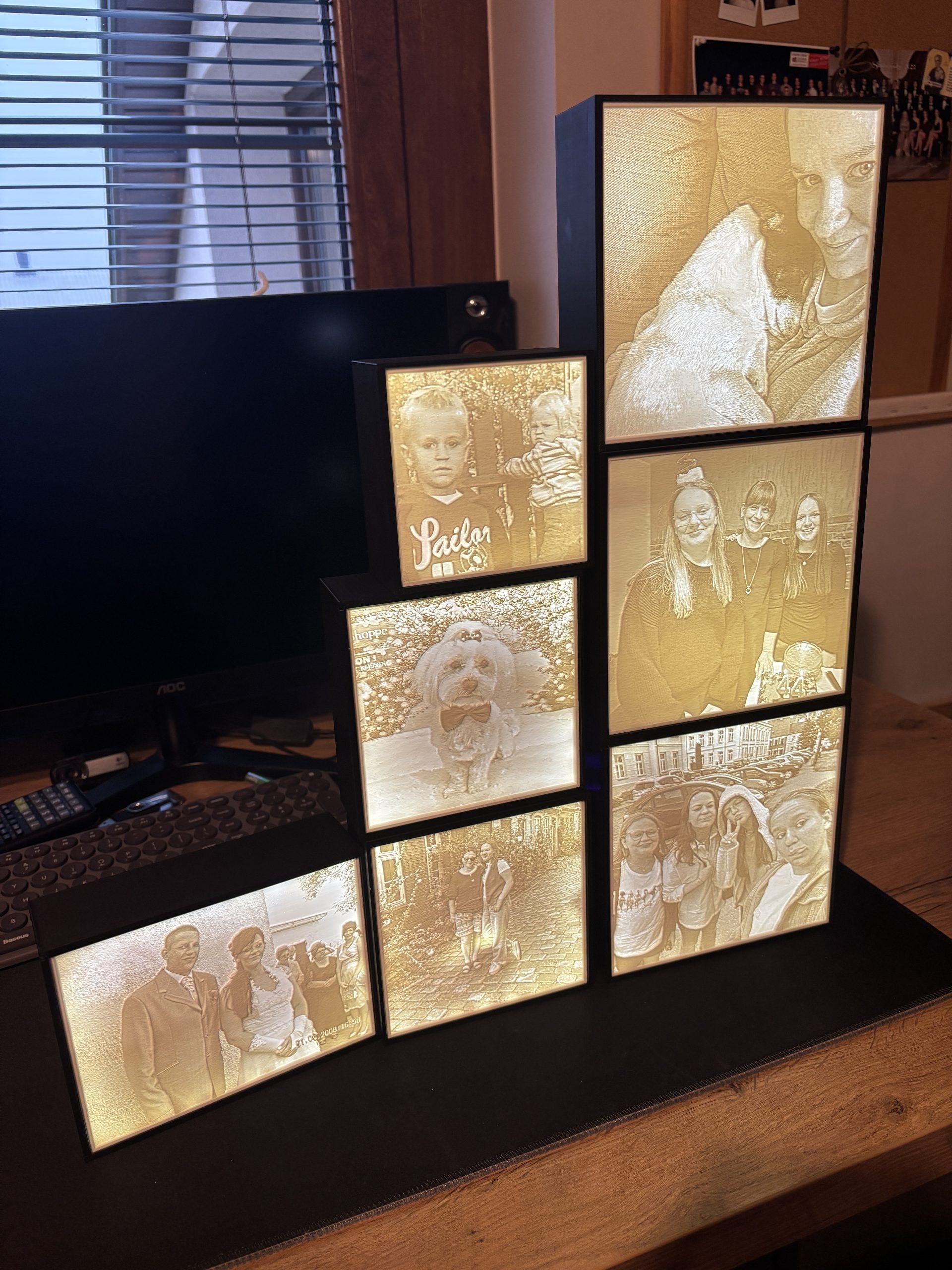 Tworzymy podświetlane ramki, które zamieniają zwykłe zdjęcie w efekt 3D widoczny dopiero po zapaleniu światła. Każdy projekt przygotowujemy indywidualnie – od dopasowania kontrastu po finalny wydruk.